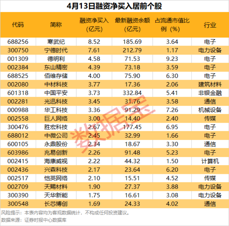 具体到个股,4月13日共有2183只股获融资净买入,净买入金额在1亿元以上的有41只,其中7只融资净买入额超3.5亿元。寒武纪融资净买入额居首,当日净买入8.52亿元,其次是宁德时代、德明利,融资净买入金额分别为7.61亿元、4.58亿元,融资净买入金额居前的还有东山精密、佰维存储、中材科技等。