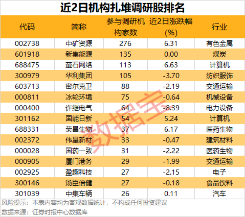 近两个交易日(4月10日至4月13日)共有43家公司公告机构调研记录,中矿资源、新集能源、萤石网络、华利集团等4家公司均获超百家机构扎堆调研。