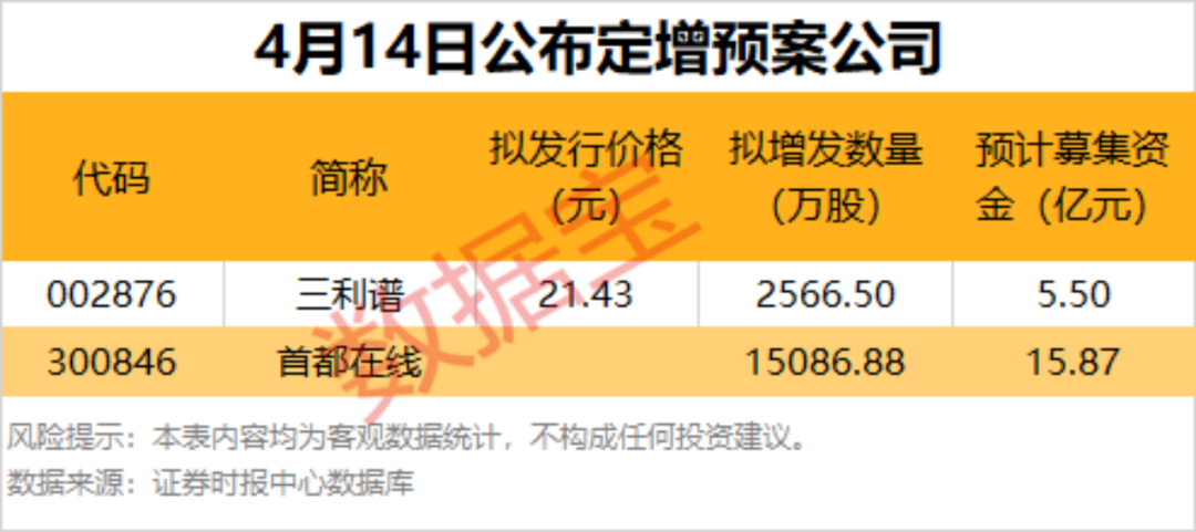 4月14日共有2家公司公布非公开发行预案。