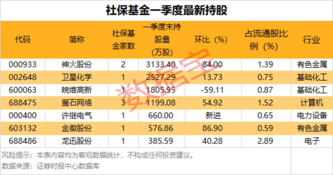 财报季,社保基金持股动向曝光!社保基金一季度末出现在7只个股前十大流通股东名单中,合计持股量1.03亿股,期末持股市值合计26亿元。持股变动显示,新进1只,增持5只,减持1只。