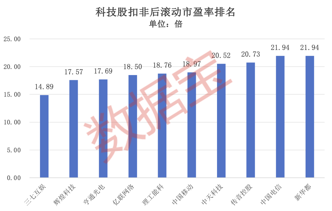 数据宝从多维度梳理出估值较低的科技股。据证券时报·数据宝统计,从最新扣非后的滚动市盈率来看,在TMT行业中(属于计算机、传媒、电子、通信等一级行业,剔除出版、电视广播、影视等二级行业),有6股滚动市盈率低于20倍,分别是三七互娱、辉煌科技、亨通光电、亿联网络、理工能科、中国移动。