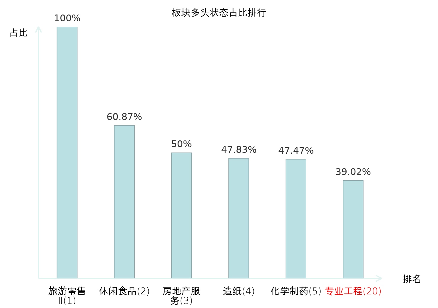 全市场所有行业板块中主力多头状态占比排名中,旅游零售Ⅱ板块位居第一。种植业板块名次提升最快,较昨日上升49位。