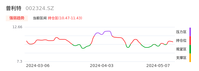 我们来看一下该股的九方特色指标强弱趋势的情况:普利特近日从观望区上穿到持仓区。股价短期站上多头区域,但还未完全站稳。后续重点关注多空分界点的争夺:10.47元。如未能有效站稳则可能重新回到空头行情。