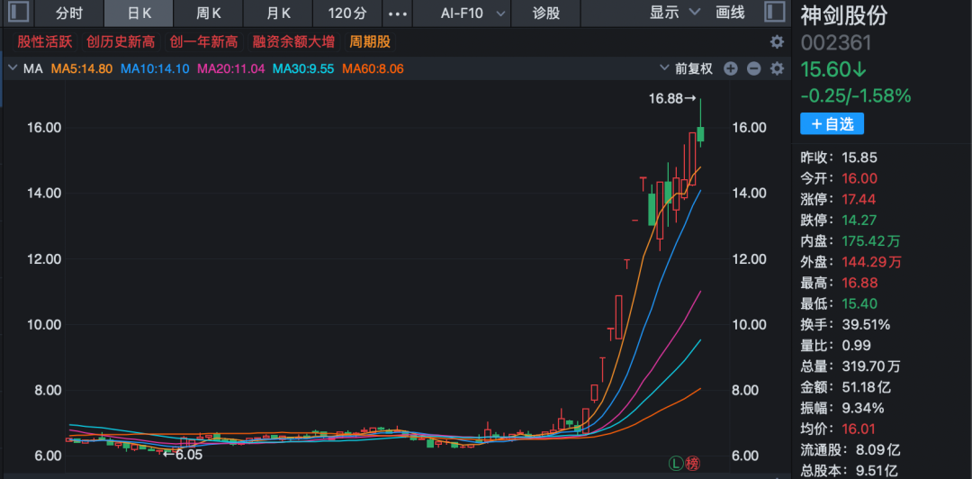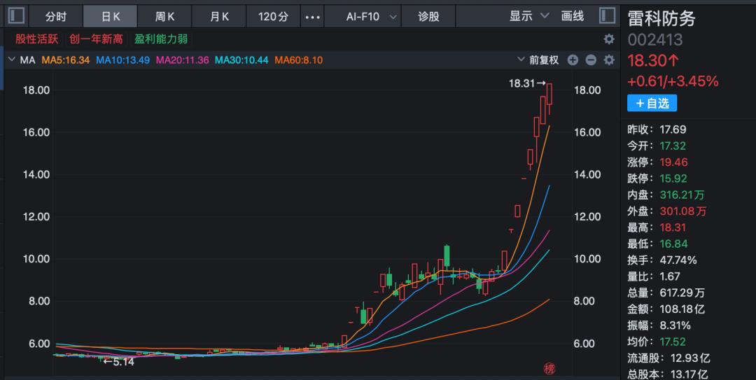 市场热点方面,军工股持续火爆,航天装备方向领涨,板块指数全周飙升逾26%,连续第7周上涨,累计涨幅高达逾137%,为跨年行情最牛板块。神剑股份15天10涨停,雷科防务8天6板,航天电子10天5板,中国卫通9天5板。