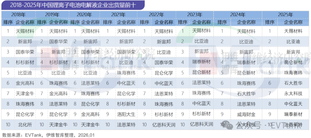 从主要企业来看,天赐材料以72万吨的出货量排名第一,其市场份额提升至32.2%,已经连续十年排名全球第一。2025年出货量同比增速较快的企业包括石大胜华、永太科技、昆仑新材和珠海赛玮,四家企业的出货量同比增速均超过70%,大幅跑赢行业增速。2025年度前十企业中,昆仑新材上升一位排名行业第四,瑞泰新材和法恩莱特的出货量排名下滑较为明显。