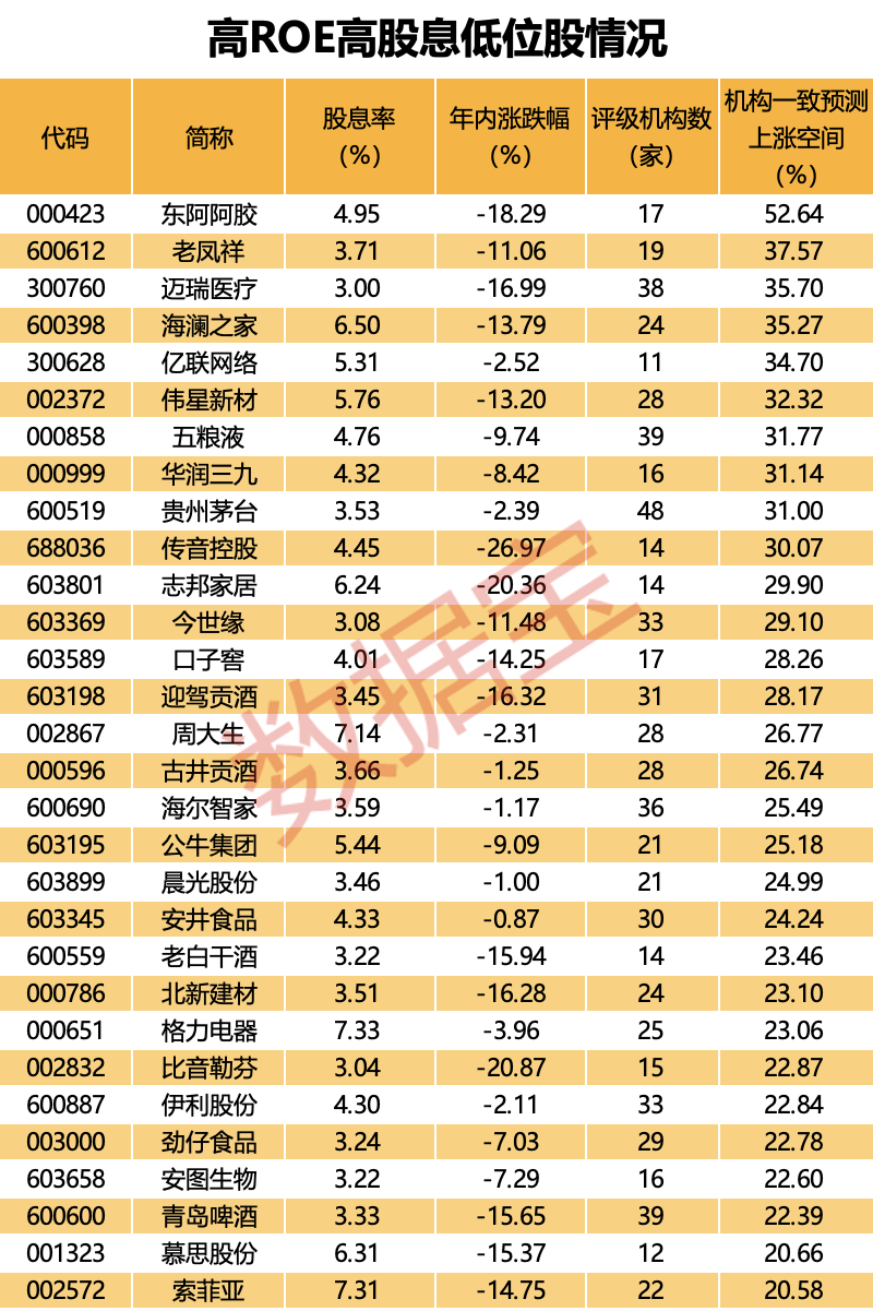 值得一提的是,这些高股息的股票普遍得到机构的青睐,其中多达11股获得社保和险资共同重仓,包括老白干酒、海油发展、公牛集团等。