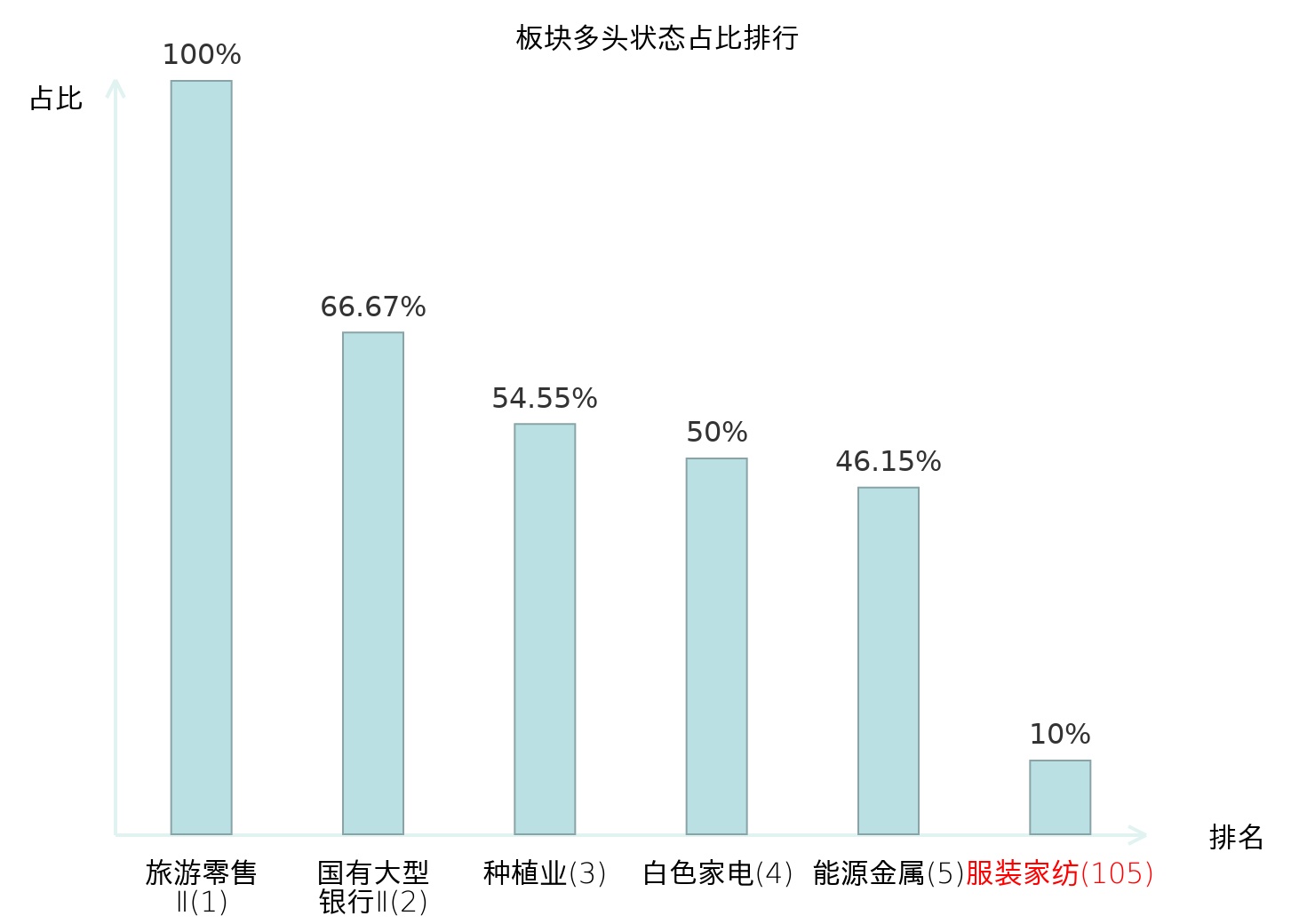 全市场所有行业板块中主力多头状态占比排名中,旅游零售Ⅱ板块位居第一。食品加工板块名次提升最快,较昨日上升57位。