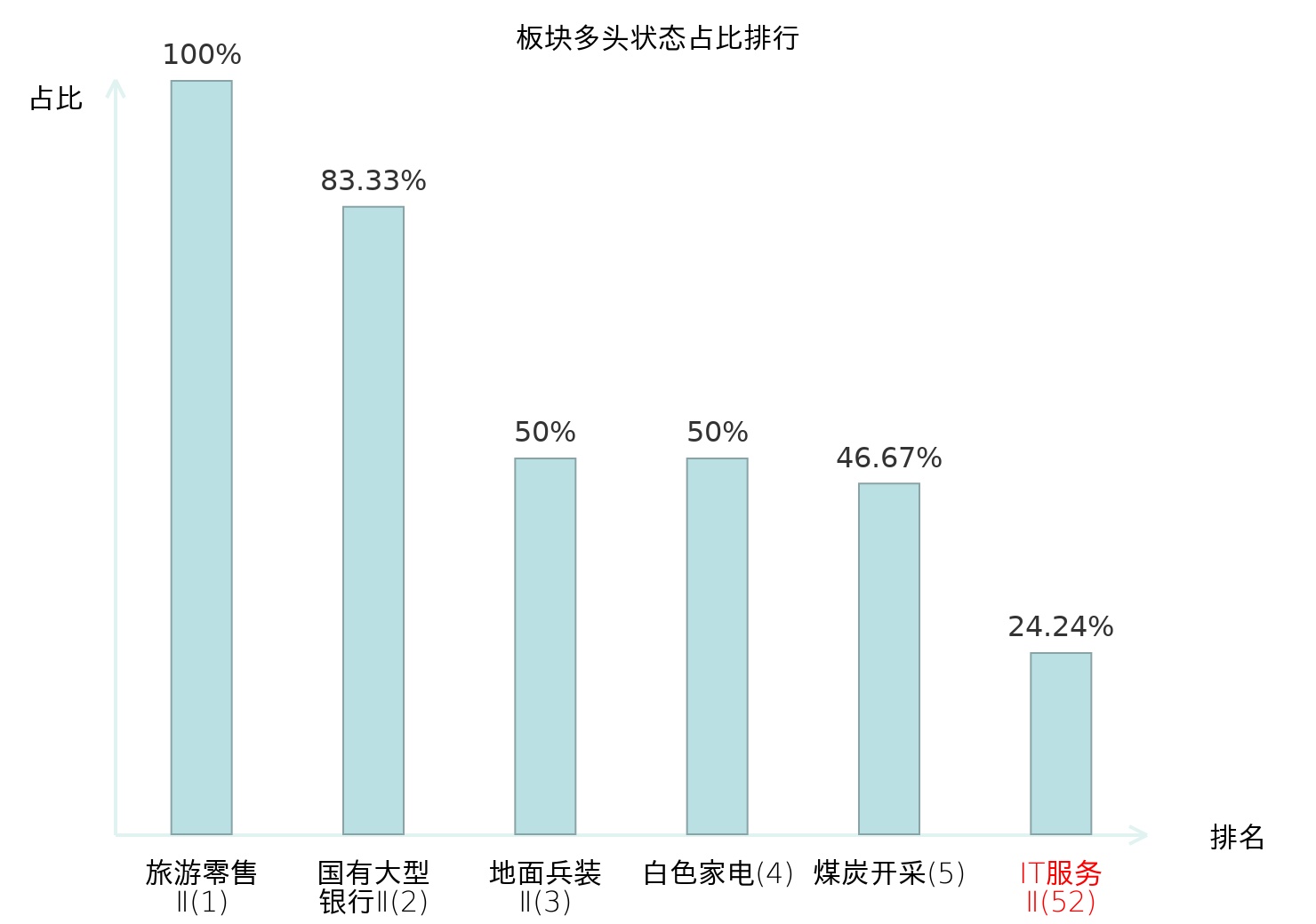 全市场所有行业板块中主力多头状态占比排名中,旅游零售Ⅱ板块位居第一。油服工程板块名次提升最快,较昨日上升107位。