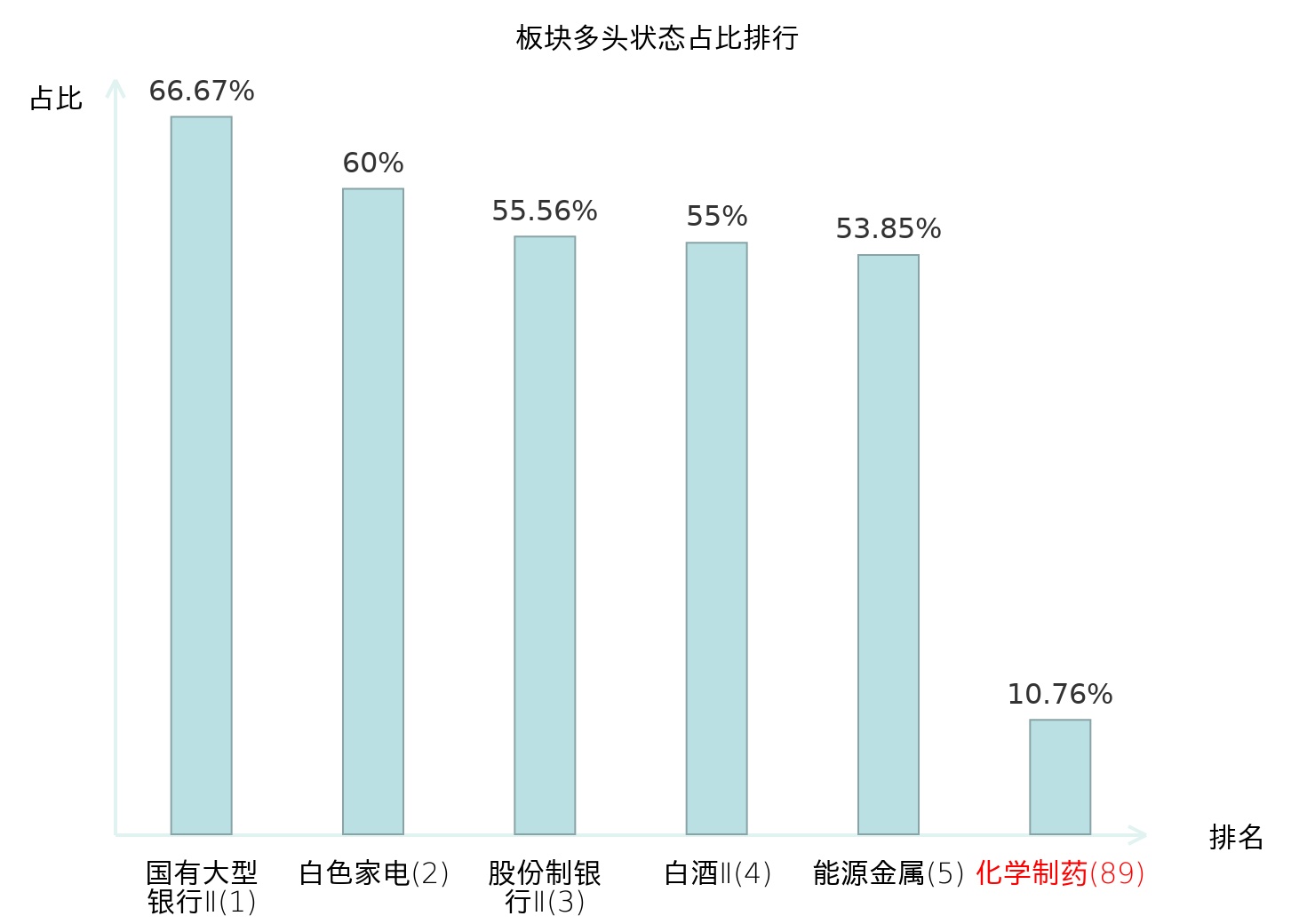全市场所有行业板块中主力多头状态占比排名中,国有大型银行Ⅱ板块位居第一。林业Ⅱ板块名次提升最快,较昨日上升99位。