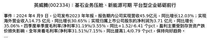 值得注意的是:2024年04月长城证券的于夕朦/侯宾分析师,首次发布关于英威腾的研究报告,标题为:英威腾(002334):基石业务压舱、新能源可期 平台型企业砥砺前行。