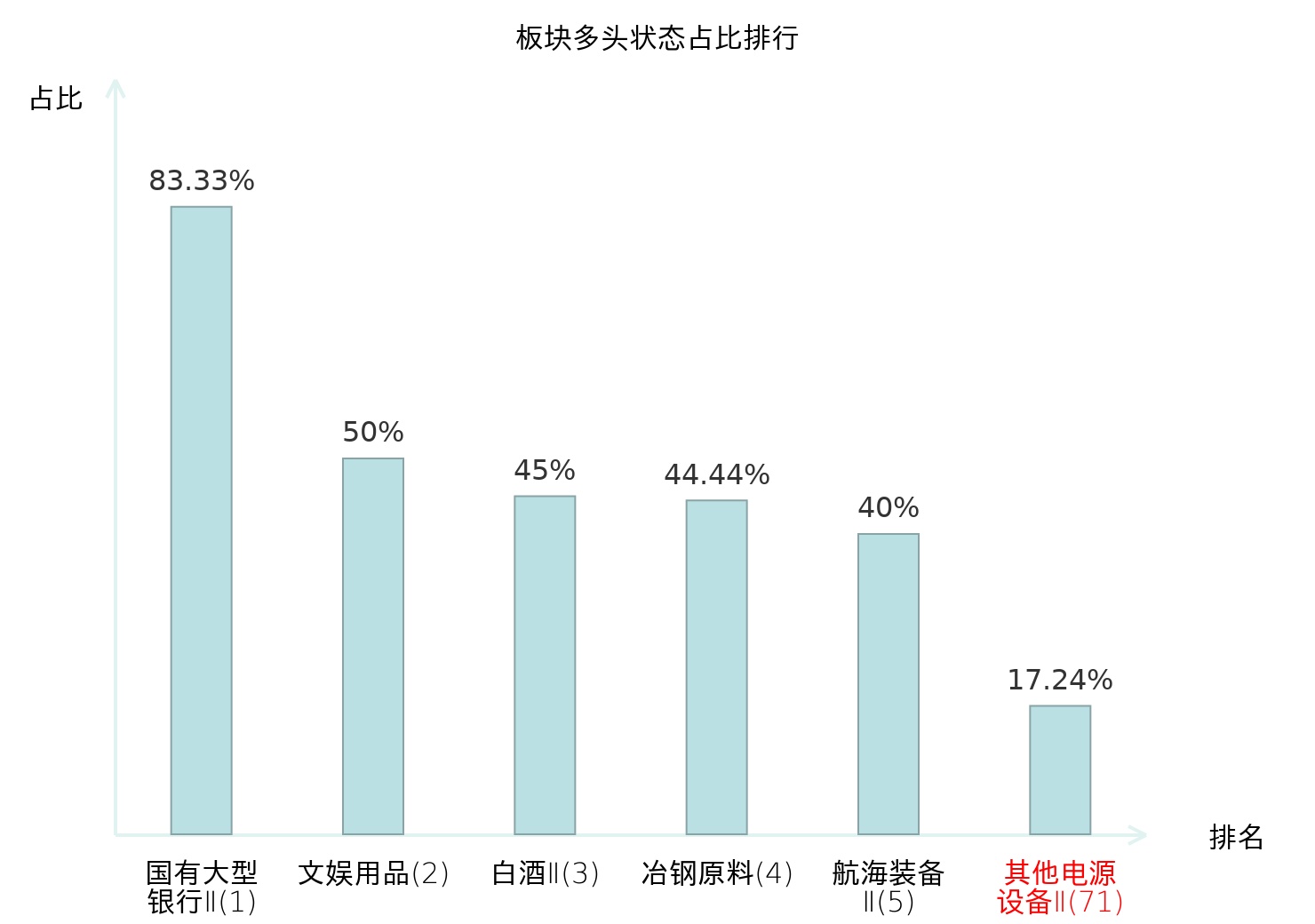 全市场所有行业板块中主力多头状态占比排名中,国有大型银行Ⅱ板块位居第一。其他家电Ⅱ板块名次提升最快,较昨日上升116位。
