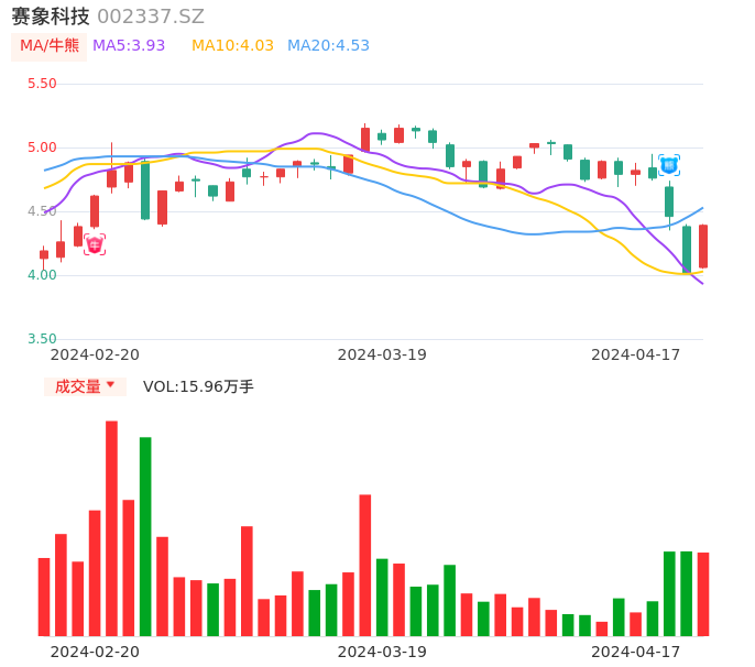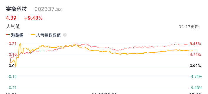 04月17日,赛象科技收报4.39,股价涨幅9.48%,成交金额6832.83万元,换手率2.71%。