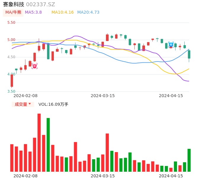 04月15日,赛象科技收报4.46,股价涨幅-6.30%,成交金额7269.02万元,换手率2.74%。