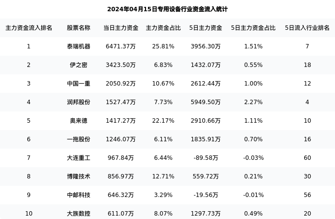 从主力资金流向来看,专用设备行业今日主力资金流入44.10亿元,在所有申万二级行业中排名:3/131。
