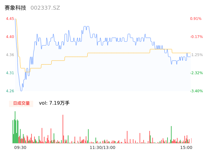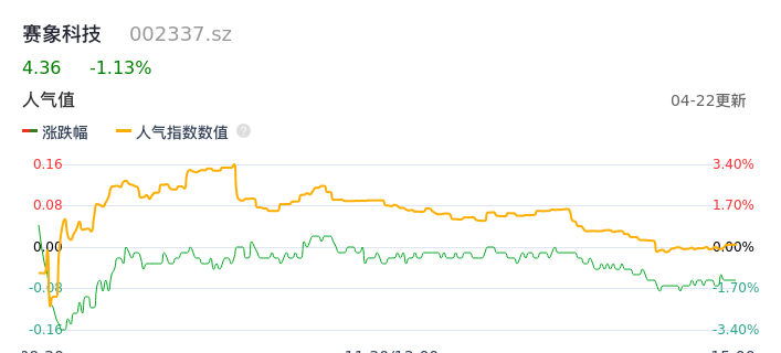 04月22日,赛象科技收报4.36,股价涨幅-1.13%,成交金额3137.61万元,换手率1.22%。
