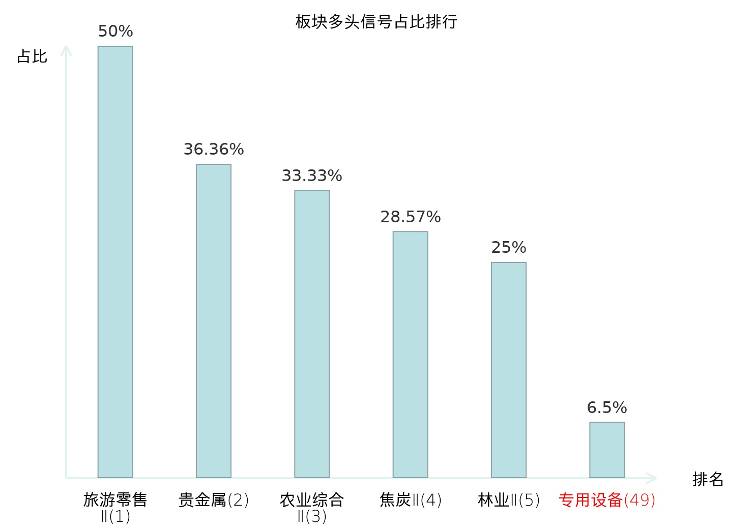 全市场所有行业板块中主力多头信号占比排名中,旅游零售Ⅱ板块位居第一。旅游零售Ⅱ板块名次提升最快,较昨日上升129位。