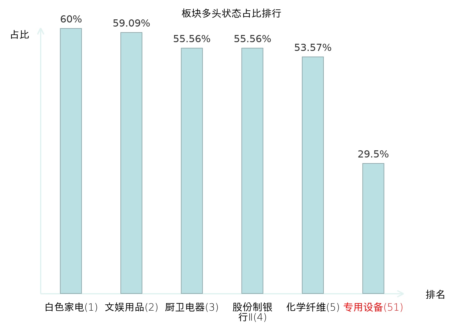 全市场所有行业板块中主力多头状态占比排名中,白色家电板块位居第一。林业Ⅱ板块名次提升最快,较昨日上升78位。