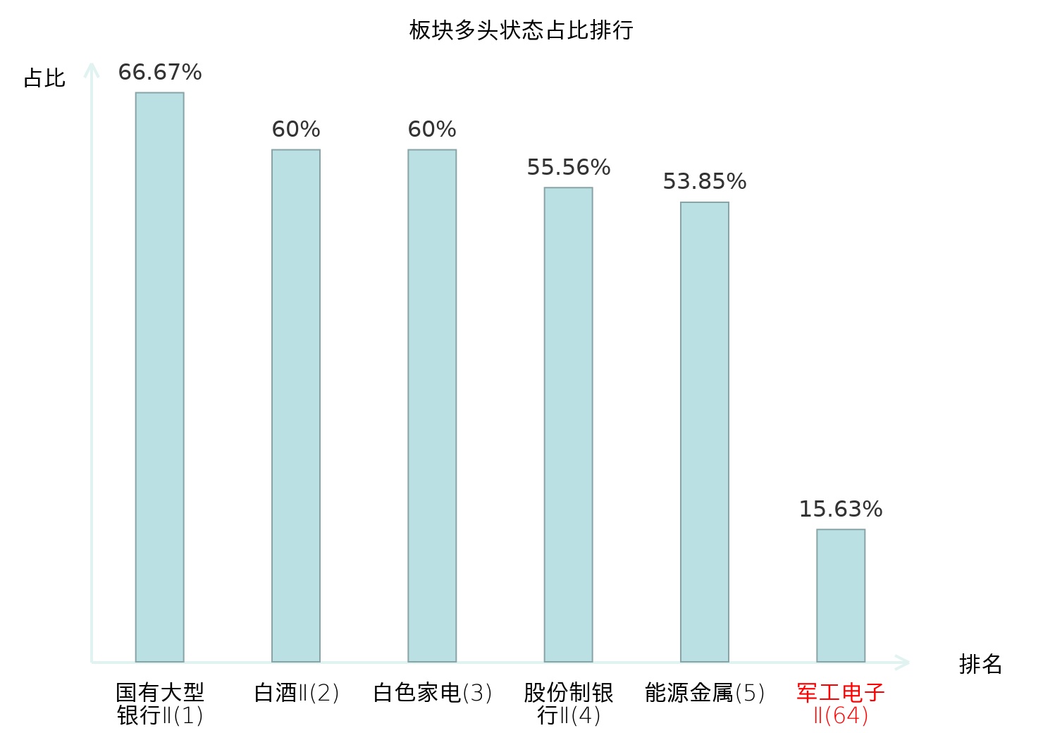 全市场所有行业板块中主力多头状态占比排名中,国有大型银行Ⅱ板块位居第一。电子化学品Ⅱ板块名次提升最快,较昨日上升55位。