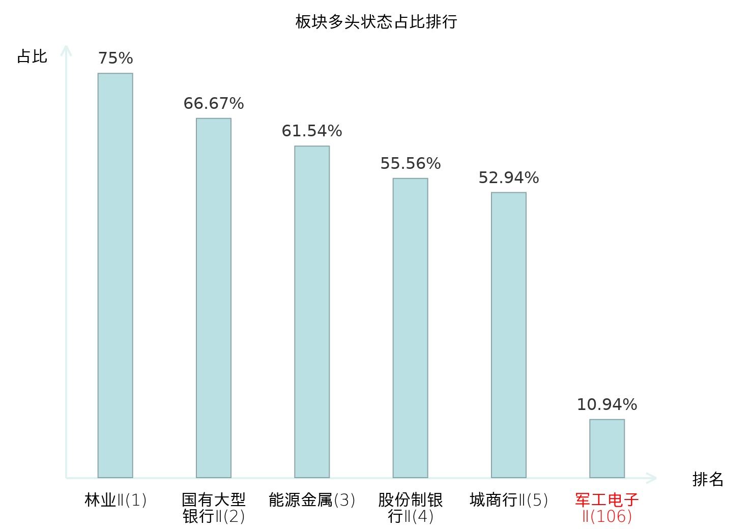 全市场所有行业板块中主力多头状态占比排名中,林业Ⅱ板块位居第一。动物保健Ⅱ板块名次提升最快,较昨日上升82位。