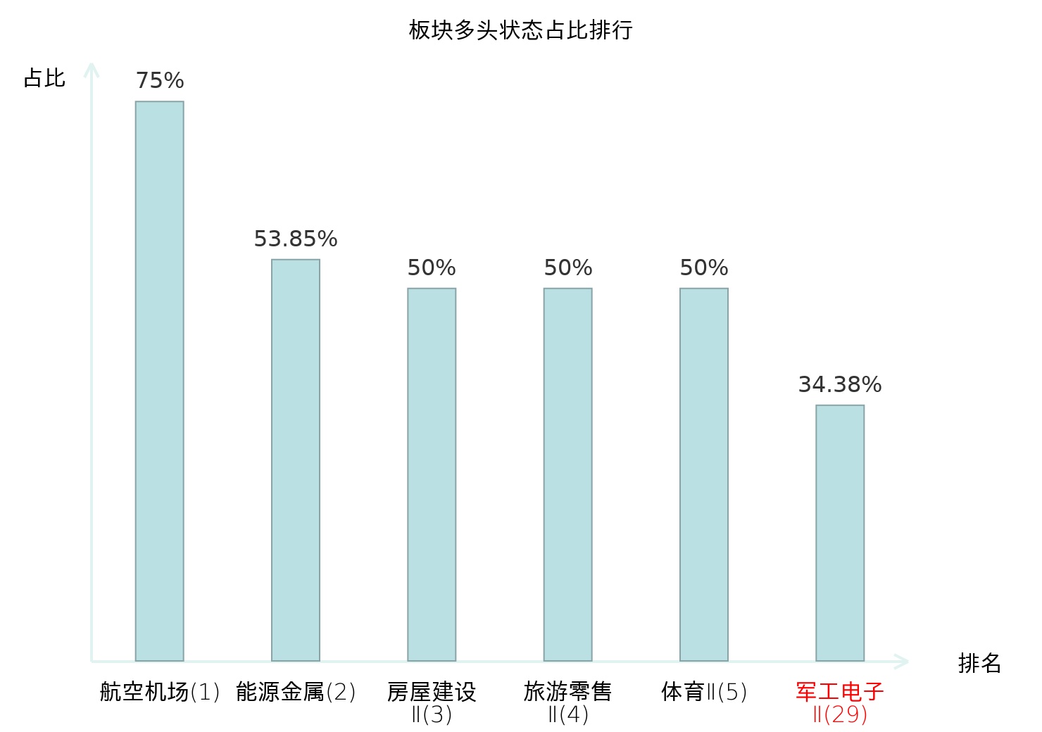 全市场所有行业板块中主力多头状态占比排名中,航空机场板块位居第一。其他电子Ⅱ板块名次提升最快,较昨日上升53位。