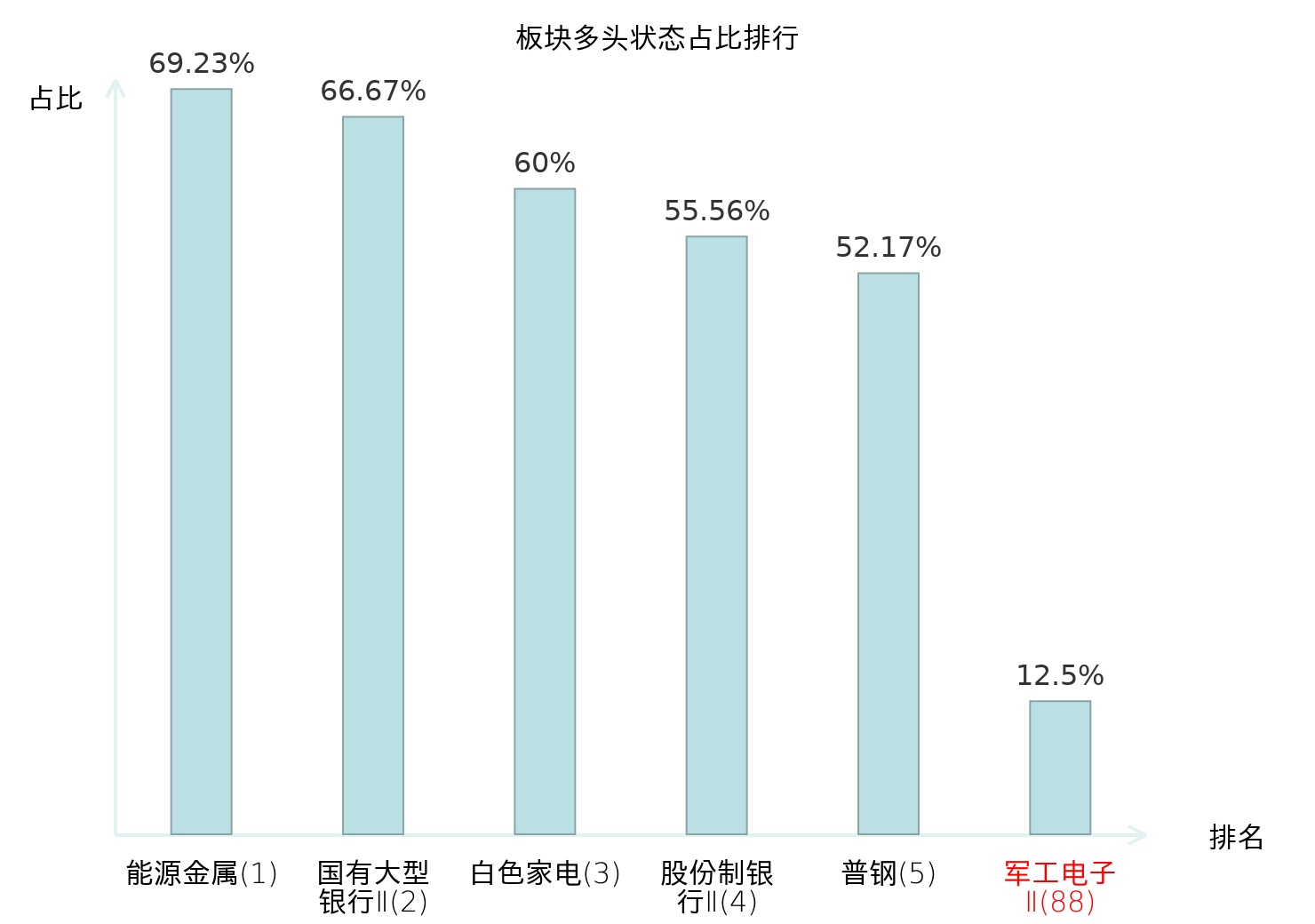 全市场所有行业板块中主力多头状态占比排名中,能源金属板块位居第一。贸易Ⅱ板块名次提升最快,较昨日上升69位。