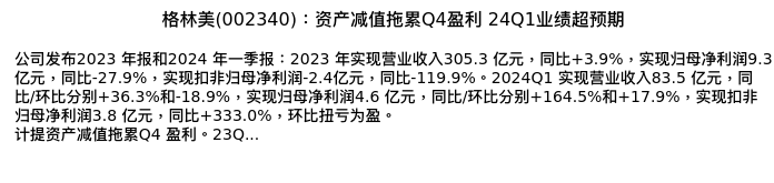 值得注意的是:2024年05月招商证券的刘伟洁/宋盈盈/赖如川分析师,首次发布关于格林美的研究报告,标题为:格林美(002340):资产减值拖累Q4盈利 24Q1业绩超预期。