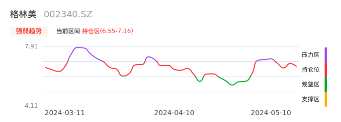 我们来看一下该股的九方特色指标强弱趋势的情况:格林美自05月07日从压力区回到持仓区。股价近期持续调整。后续重点关注能否站稳多空分界点:6.55元。如被有效击穿则将进入空头行情。