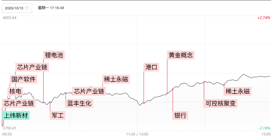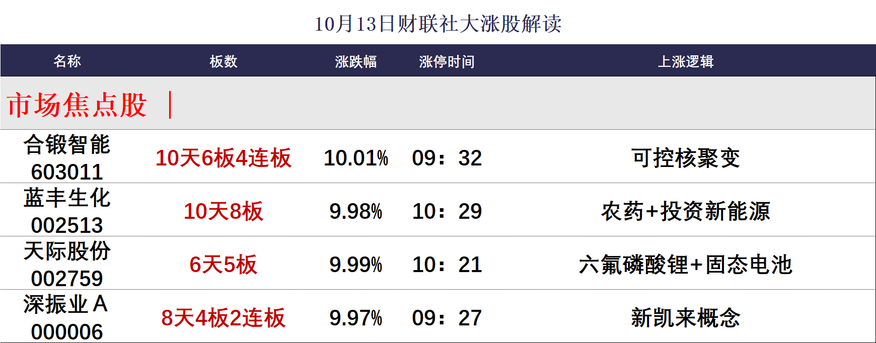 财联社10月13日讯,今日59股涨停,20股炸板,封板率为75%,合锻智能4连板,安泰科技、白银有色、澄星股份3连板,新莱应材20cm2连板,蓝丰生化10天8板,天际股份6天5板,深振业A8天4板,北交所同惠电子30cm首板。市场全天震荡回升,三大指数低开高走,开盘一度跌近3%的科创50指数午后翻红大涨逾1%。沪深两市成交额2.35万亿,较上一个交易日缩量1609亿。板块方面,稀土永磁、有色金属、半导体等板块涨幅居前,汽车零部件、游戏等板块跌幅居前。截至收盘,沪指跌0.19%,深成指跌0.93%,创业板指跌1.11%。