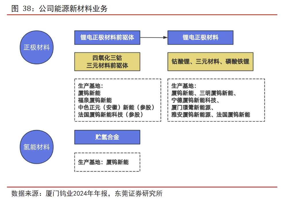 能源新材料业务。公司能源新材料业务主要由控股子公司厦钨新能运营,主要产品包括面向3C消费电子领域的钴酸锂、面向动力电池领域的三元材料,面向储能和动力电池领域的磷酸铁锂,用于氢能市场的储氢材料等。2024年公司锂离子正极材料销量9.86万吨,稳居国内行业前列;氢能材料销量0.39万吨,巩固贮氢合金国内领先地位。公司是钴酸锂领域的全球龙头,市场份额位居世界第一。三元材料方面,公司是高电压、高功率细分市场的技术龙头,聚焦深度研发,赋能高端纯电汽车、低空经济等领域。