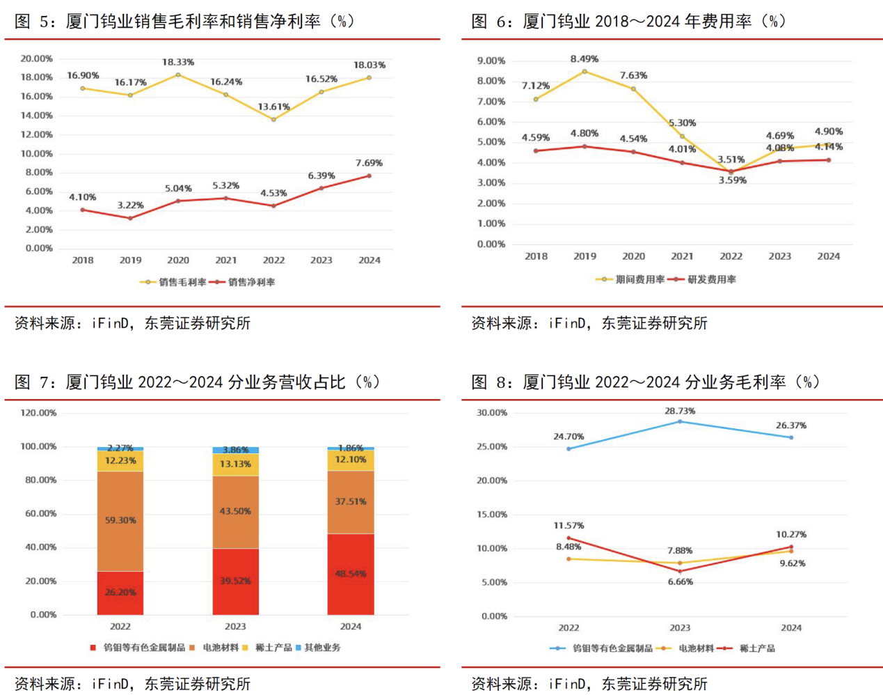 分业务来看,2024年,钨钼业务实现营收174.14亿元,同比增加5.78%,钨精矿涨价以及细钨丝销量增加推高利润;稀土业务实现营收44.35亿元,同比下降19.21%,利润增加67.44%,主要因磁性材料销量同比提升16%;能源新材料业务,公司实现营收132.97亿元,同比下降23.19%,产销量方面,在消费电子市场复苏及产品升级下,公司钴酸锂、三元材料销量同比增长约33%。