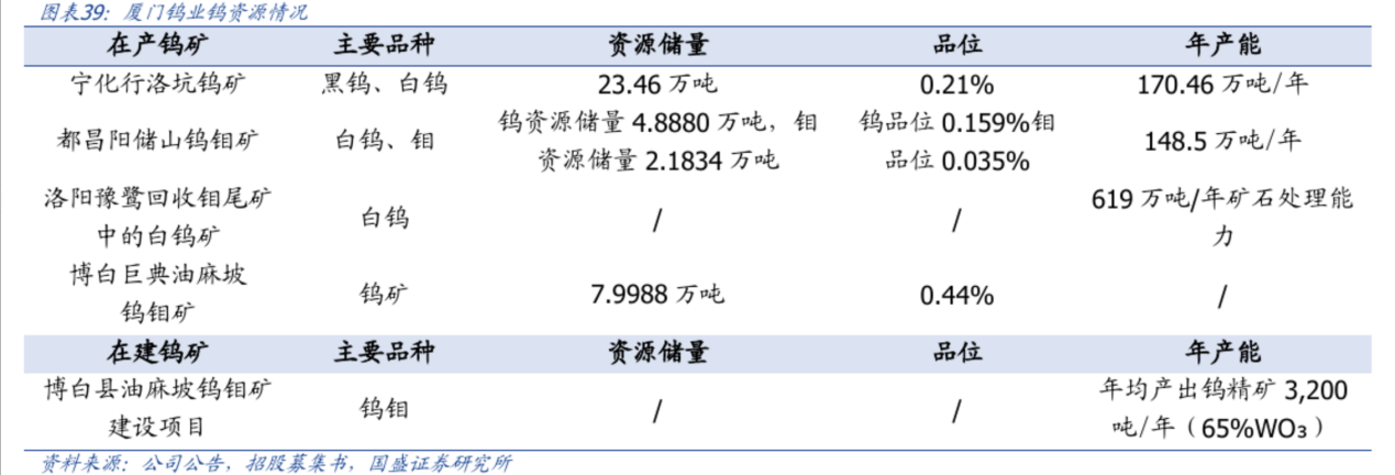 钨矿开采端,目前公司拥有四家钨矿企业,其中宁化行洛坑、都昌金鼎、洛阳豫鹭为在产企业,三家年产量合计约7000至8000吨金属吨;此外博白巨典钨钼矿为在建矿山,达产后预计每年产出钨精矿约2000金属吨。公司直接和间接控制的钨矿山金属储量近200万吨,占全国30%左右。