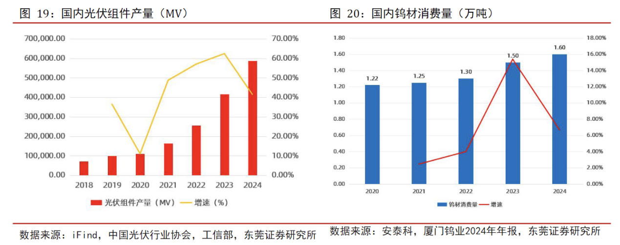 2024年,国内钨材产量达到1.6万吨,同比增长6.67%。展望未来,随着全球光伏装机量持续增长,钨丝金刚线的渗透率将稳步提升,有望成为拉动钨需求的新兴增长极。