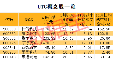 相比上个月,UTG概念股成交放量明显。数据宝统计,11月以来,这些概念股日均成交5.41亿元,环比增长19.96%。长信科技、凯盛科技、鼎龙股份等日均成交环比增幅超20%。其中长信科技成交放量最明显,11月以来日均成交8.64亿元,环比增长152.5%。