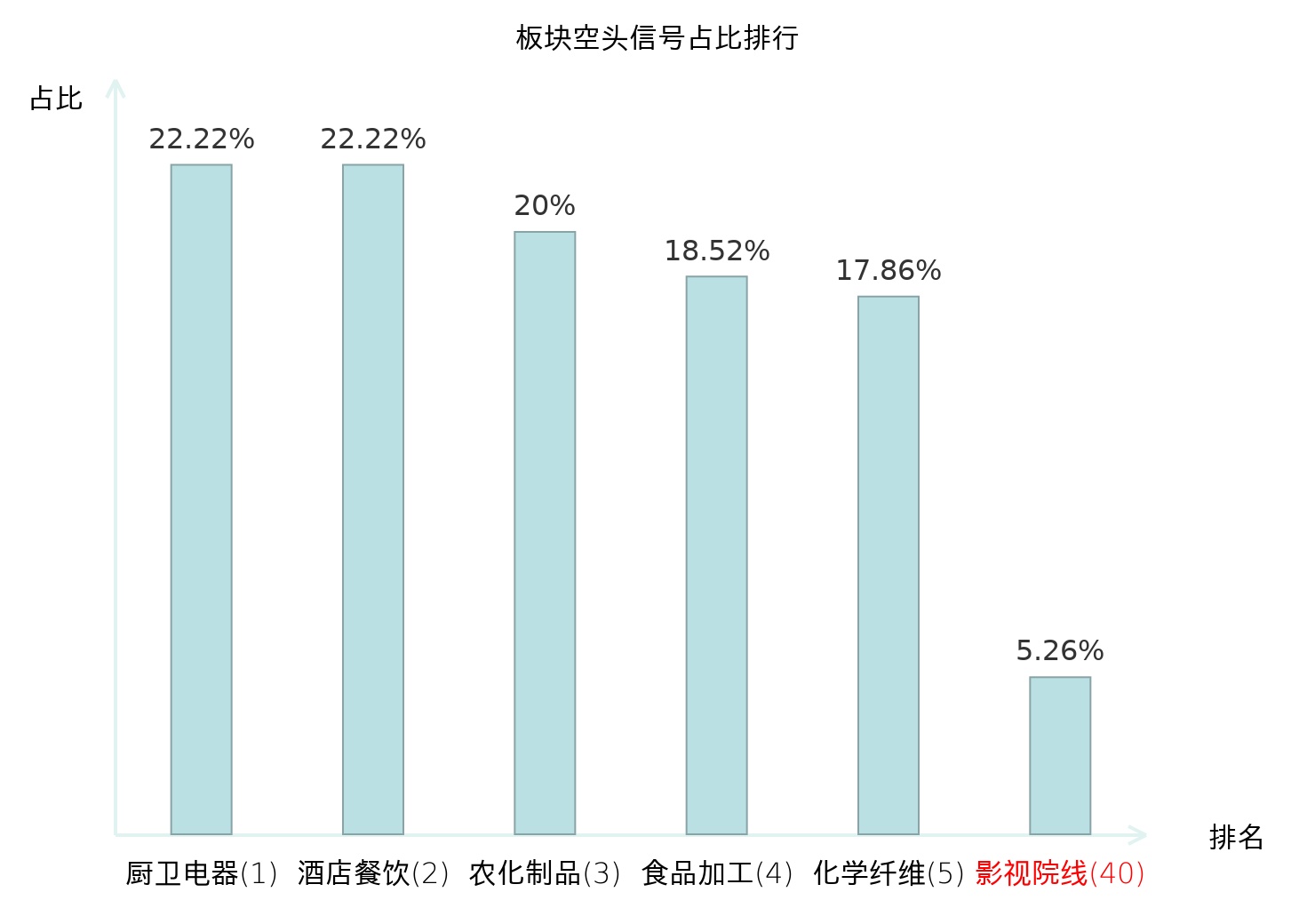 全市场所有行业板块中主力空头信号占比排名中,厨卫电器板块位居第一。化学纤维板块名次提升最快,较昨日上升119位。