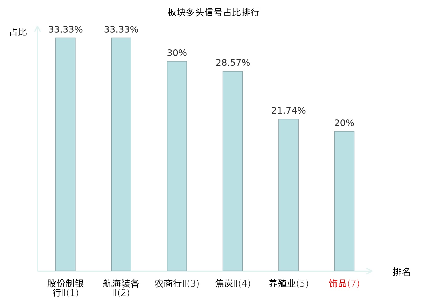 全市场所有行业板块中主力多头信号占比排名中,股份制银行Ⅱ板块位居第一。焦炭Ⅱ板块名次提升最快,较昨日上升119位。