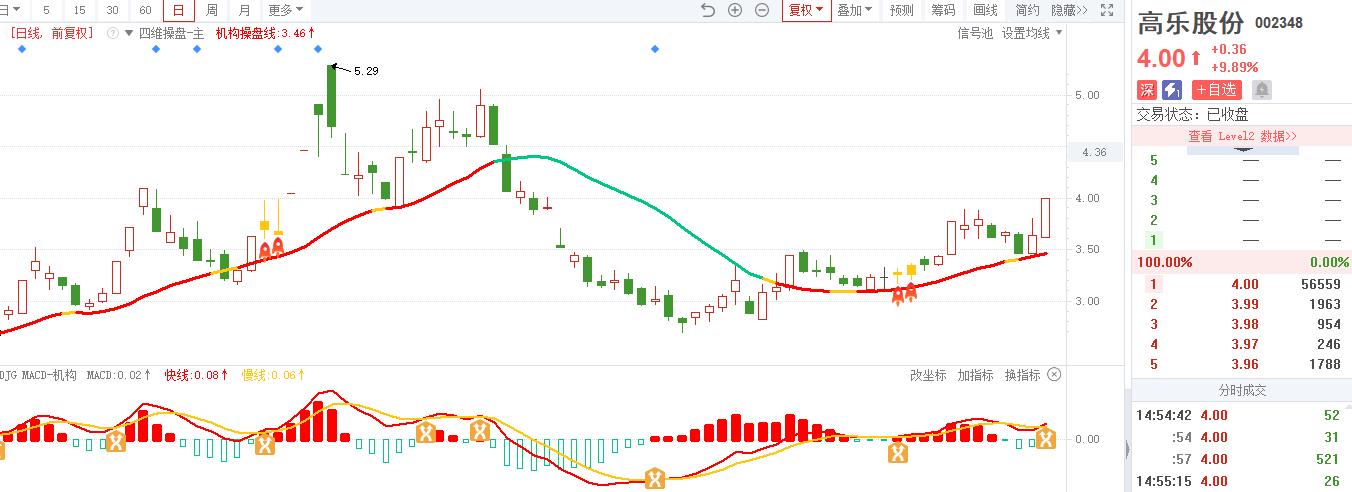 2)高乐股份-四维操盘-近期出现火箭信号且底部量柱由绿转红