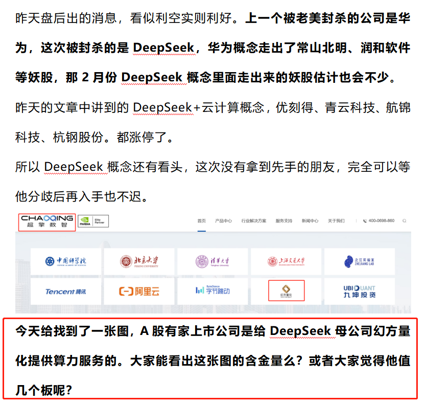 这个票从他开板就讲,他是整个deepseek的人气标杆,他可以不往上涨、甚至可以跌,但是不能破位,更不能跌停。他一旦跌停,那做deepseek的资金都会想着往外面跑,到时候一个月的获利盘,大家想想那个抛压绝对很壮观。