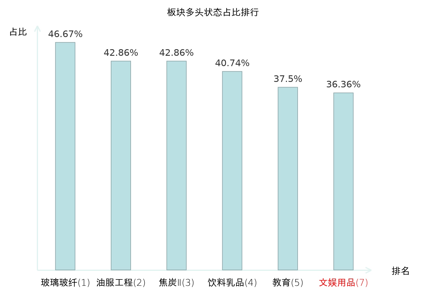 全市场所有行业板块中主力多头状态占比排名中,玻璃玻纤板块位居第一。航空机场板块名次提升最快,较昨日上升43位。