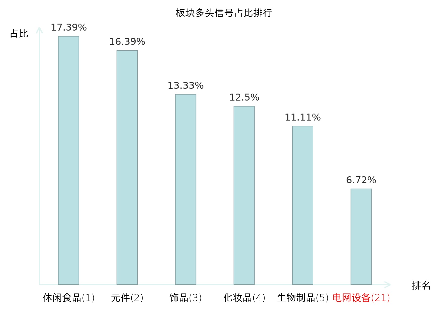 全市场所有行业板块中主力多头信号占比排名中,休闲食品板块位居第一。厨卫电器板块名次提升最快,较昨日上升108位。