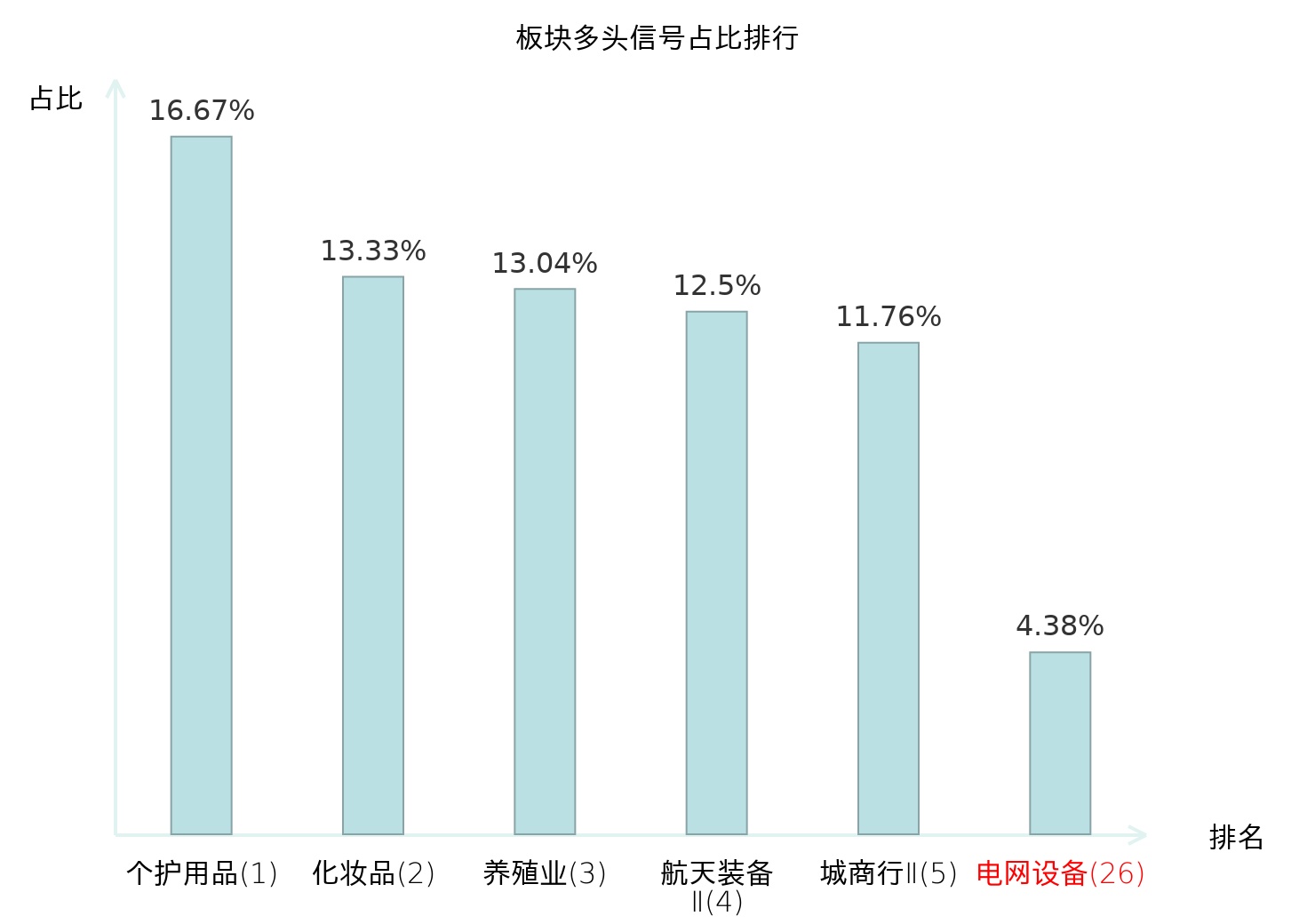 全市场所有行业板块中主力多头信号占比排名中,个护用品板块位居第一。航天装备Ⅱ板块名次提升最快,较昨日上升118位。