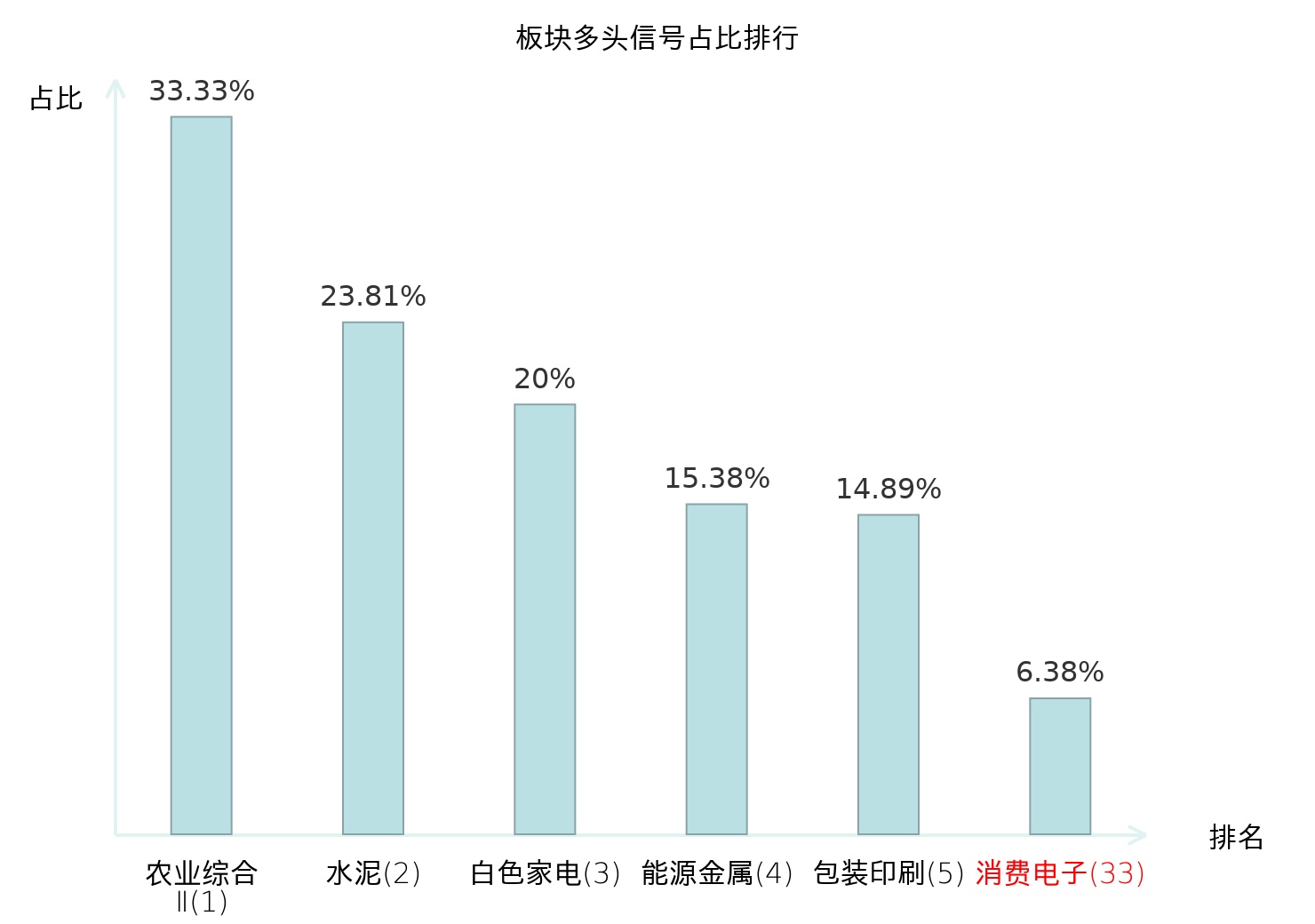 全市场所有行业板块中主力多头信号占比排名中,农业综合Ⅱ板块位居第一。农业综合Ⅱ板块名次提升最快,较昨日上升127位。