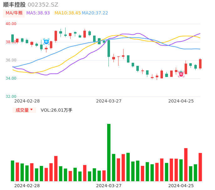 04月25日,顺丰控股收报36.09,股价涨幅2.85%,成交金额9.32亿元,换手率0.53%。