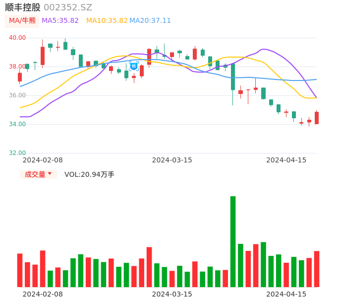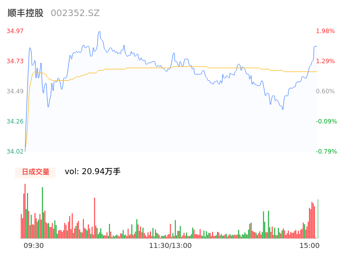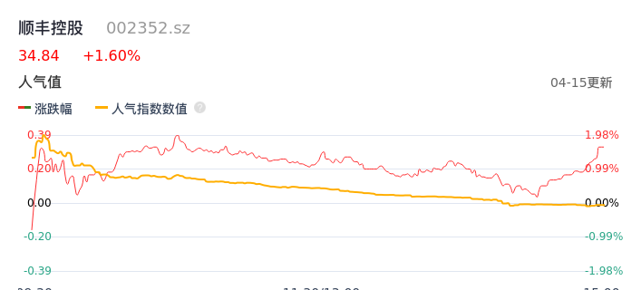 04月15日,顺丰控股收报34.84,股价涨幅1.60%,成交金额7.26亿元,换手率0.43%。