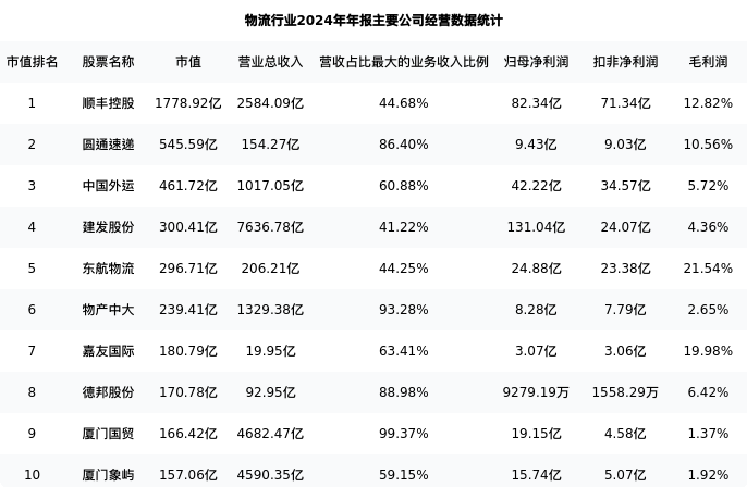 顺丰控股最新报告期数据为年报,下表汇总了物流行业内市值靠前的公司年报主要经营数据