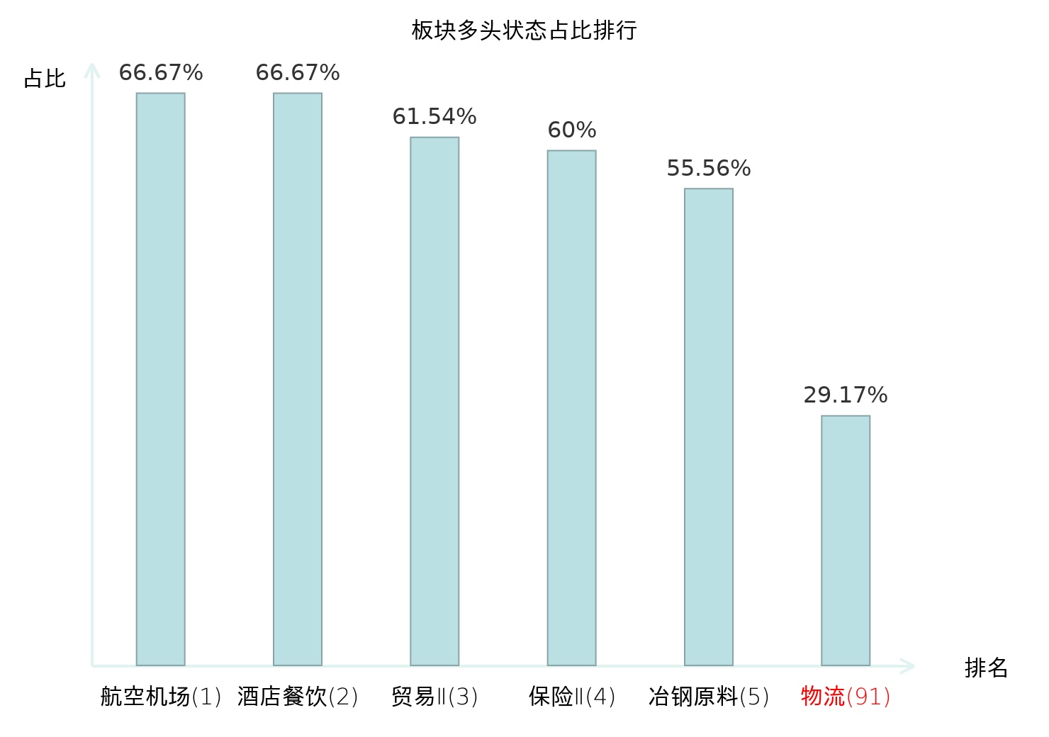 全市场所有行业板块中主力多头状态占比排名中,航空机场板块位居第一。农业综合Ⅱ板块名次提升最快,较昨日上升64位。
