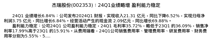 值得注意的是:2024年04月东方证券的杨震/丁昊分析师,首次发布关于杰瑞股份的研究报告,标题为:杰瑞股份(002353):24Q1业绩略增 盈利能力稳定。