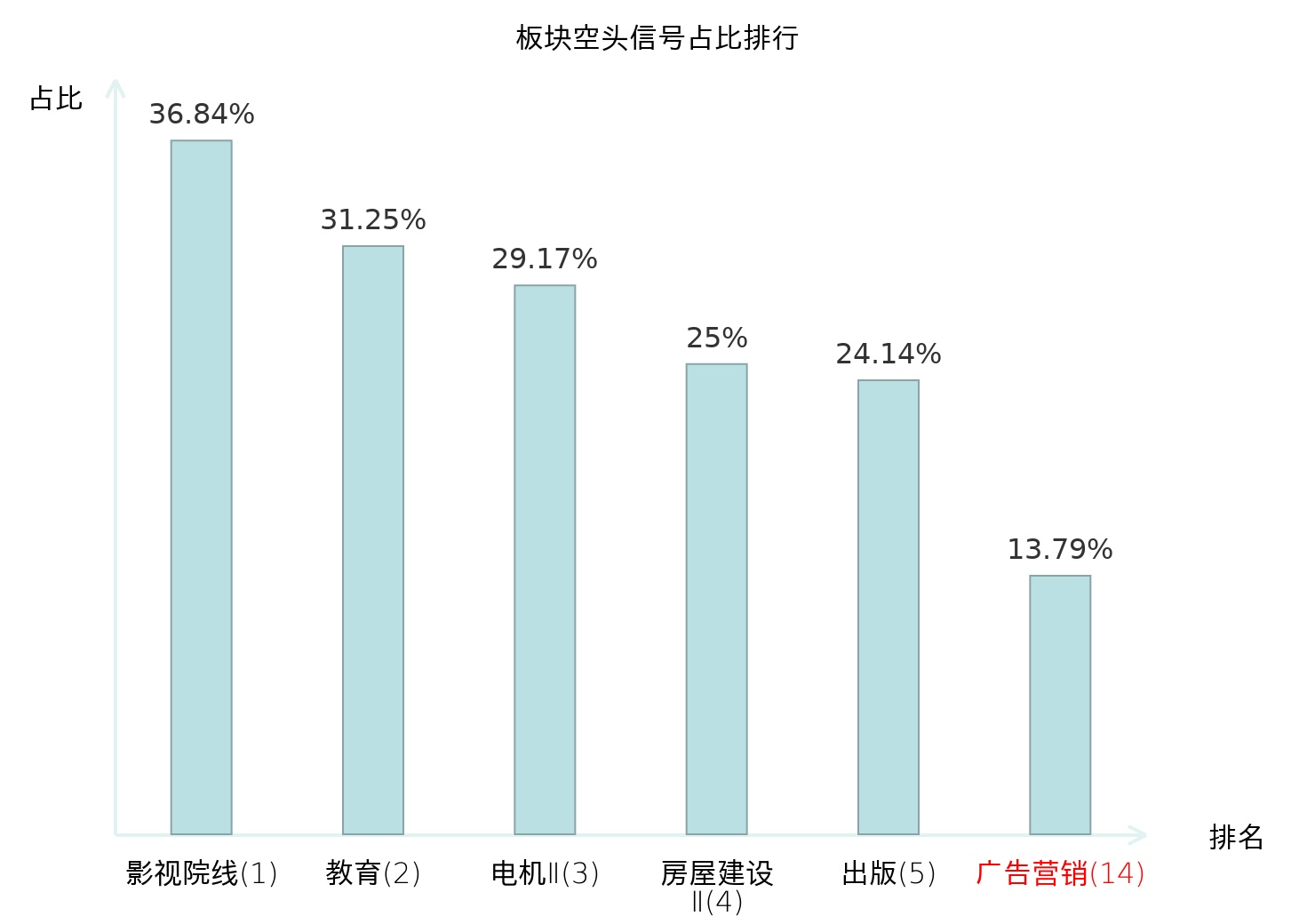 全市场所有行业板块中主力空头信号占比排名中,影视院线板块位居第一。出版板块名次提升最快,较昨日上升119位。