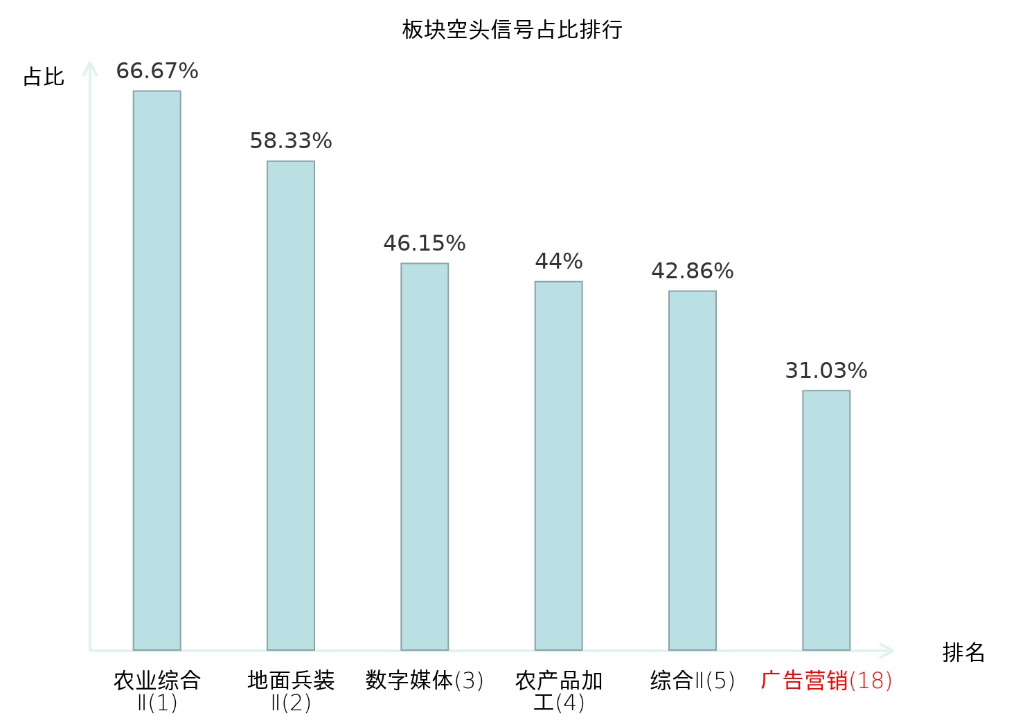 全市场所有行业板块中主力空头信号占比排名中,农业综合Ⅱ板块位居第一。医药商业板块名次提升最快,较昨日上升121位。