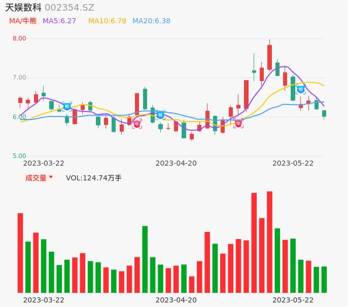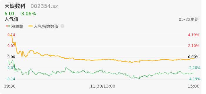 05月22日,天娱数科收报6.01,股价涨幅-3.06%,成交金额7.52亿元,换手率7.71%。