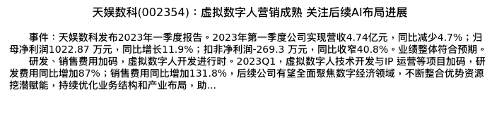 值得注意的是:2023年05月西南证券的刘言分析师,首次发布关于天娱数科的研究报告,标题为:天娱数科(002354):虚拟数字人营销成熟 关注后续AI布局进展。